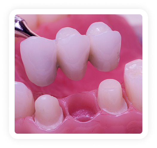 If tooth loss occurs, your dentist may recommend that a bridge be placed. A bridge consists of a replacement tooth/teeth attached to crowns on each side. The bridge is cemented to the teeth adjacent to the space, effectively replacing the missing tooth and preventing any shifting. Usually it involves two visits to have a fixed artificial tooth.