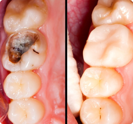 Cavities or decay occurs when enamel and dentin in some instances get demineralized and infected due to bacteria. Filling is a procedure in which this infected and demineralized part of the tooth/teeth is removed and the space filled with a choice of filling material.