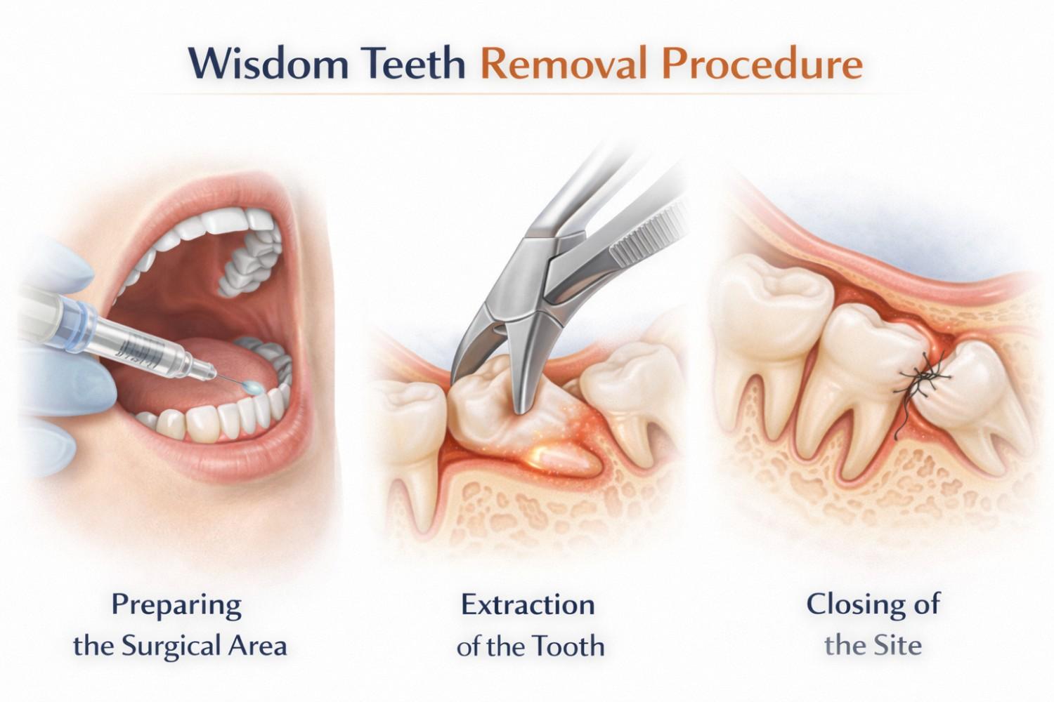The first step is a detailed clinical examination and digital X-ray to assess the position of the wisdom tooth and surrounding structures. The second step involves administering local anesthesia to ensure a painless procedure. In some cases, sedation may be recommended. The third step is the surgical removal of the wisdom tooth. If the tooth is impacted, a small incision may be made in the gum and bone to safely extract the tooth. The final step includes cleaning the area and placing sutures if required. Post-operative instructions are provided to support proper healing.